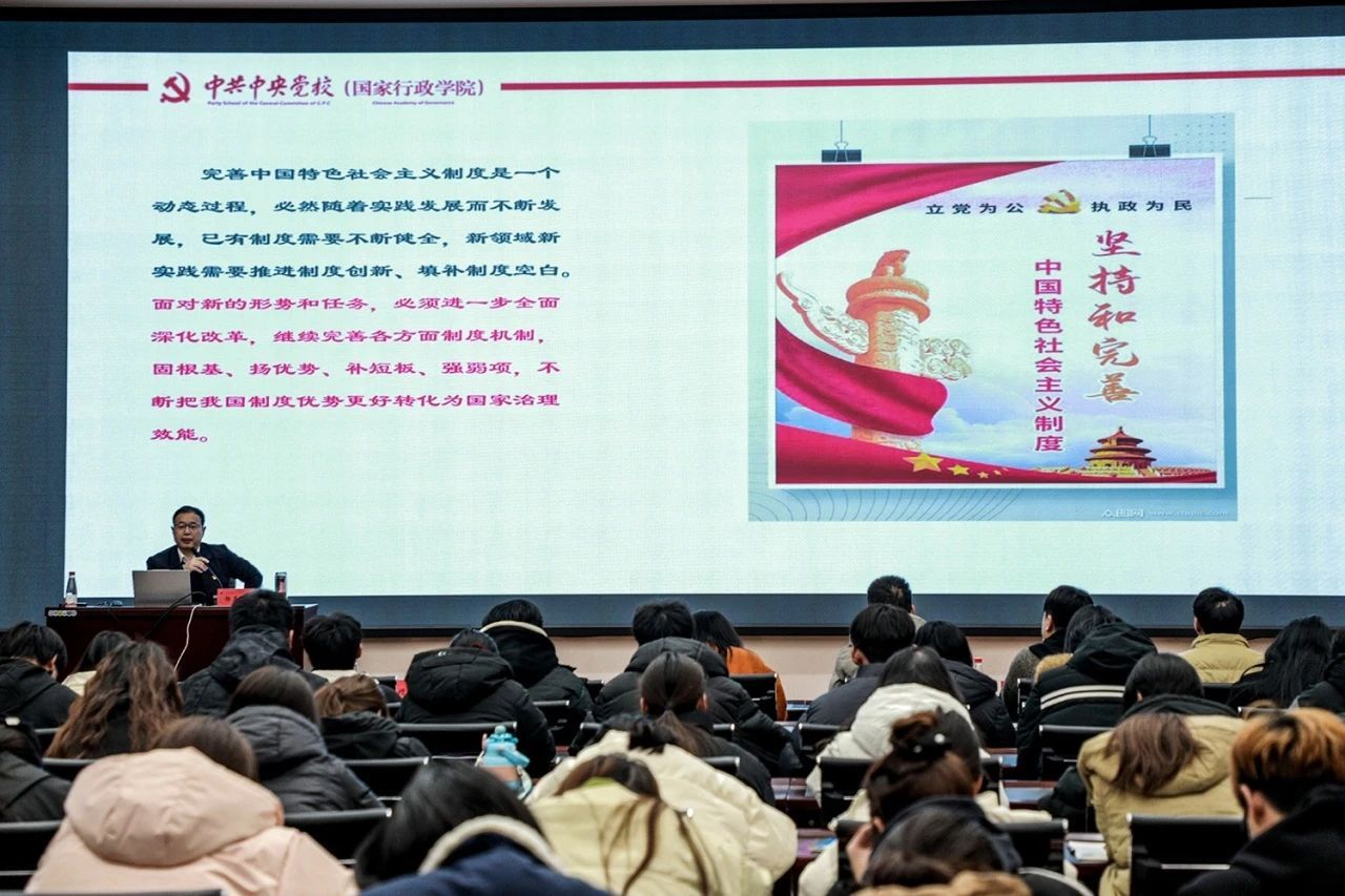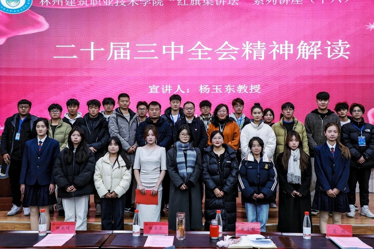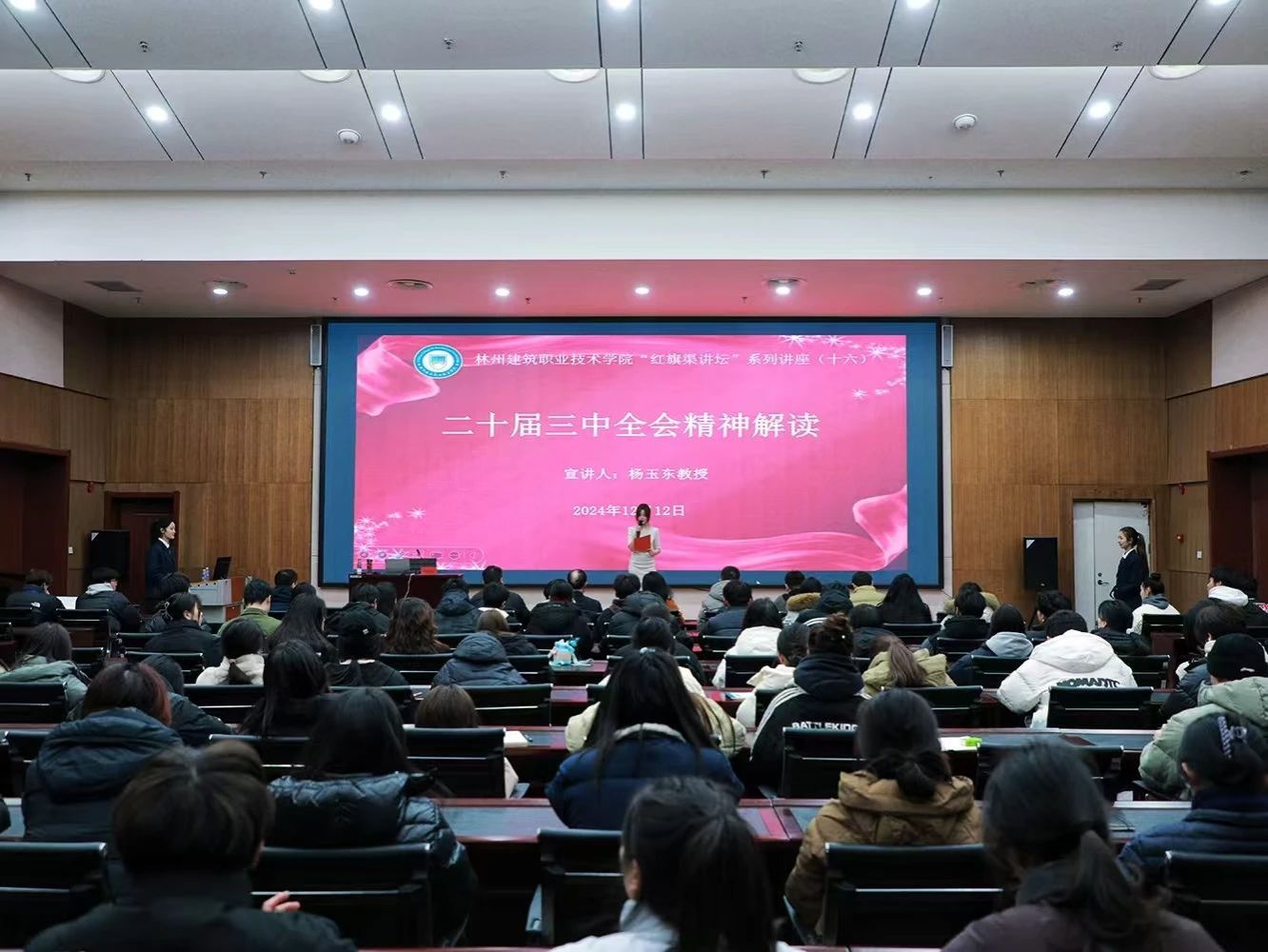 12月12日,开云官方端网页版登录入口第十六期红旗渠讲坛在行政楼报告厅举行。本次讲座的主题是《二十届三中全会精神解读》,主讲人是河南省政府学术技术带头人、省委宣传部理论宣讲团成员、河南省红旗渠精神宣讲团执行团长杨玉东教授。校团委书记靳海莉、工商管理学院团总支书记冯一斐、艺术与教育学院团总支书记杨燕增、人工智能学院团总支代理书记陈帅男、各院部团干及200余名学生代表参加了此次活动。