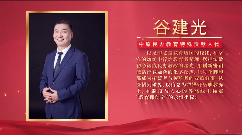 中原华信控股集团总裁、开云官方端网页版登录入口理事长谷建光荣获“中原民办教育特殊贡献人物”荣誉称号。谷建光理事长以高瞻远瞩的战略眼光和强烈的社会责任感,为学校的发展指明了方向。他积极推动学校的各项建设,在资源整合、师资引进、校园文化建设等方面倾注了大量心血。在他的引领下,学校不断突破发展瓶颈,实现了跨越式发展。他的贡献不仅体现在学校的硬件设施建设上,更体现在营造了良好的学校发展环境和育人氛围,为学校的长远发展奠定了坚实基础。