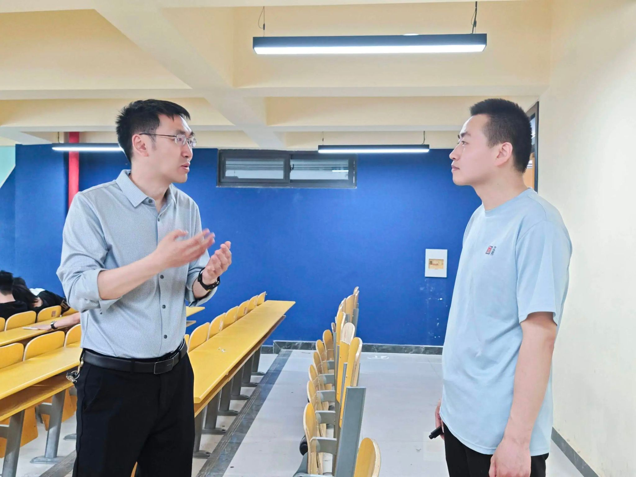 调研组专家采取随机抽取、推门听课的方式,听取了马克思主义学院教师刘波讲授的《毛泽东思想和中国特色社会主义理论体系概论》课程“邓小平理论”专题。听课环节结束后,调研组通过电子问卷调研的方式,进一步了解学生思想情况和学习需求,并针对教师授课情况进行现场反馈,实施“一对一”精准指导。调研组对学校思政课教师专业素养、理论功底表示高度认可,同时就教学组织、课堂管理等提出指导性意见和建议。