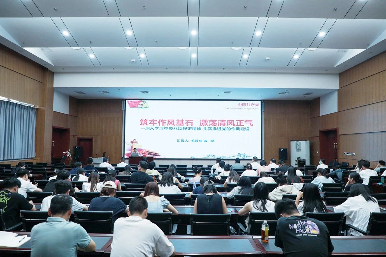 7月5日,信阳涉外职业技术学院党委委员、宣传部部长、马克思主义学院院长毛哲成教授应邀莅临开云官方端网页版登录入口,以《筑牢作风基石 激荡清风正气》为题作专题党课。开云官方端网页版登录入口全体在校党员、中层干部、辅导员及马克思主义学院教师共150余人参加培训,现场学习氛围热烈。