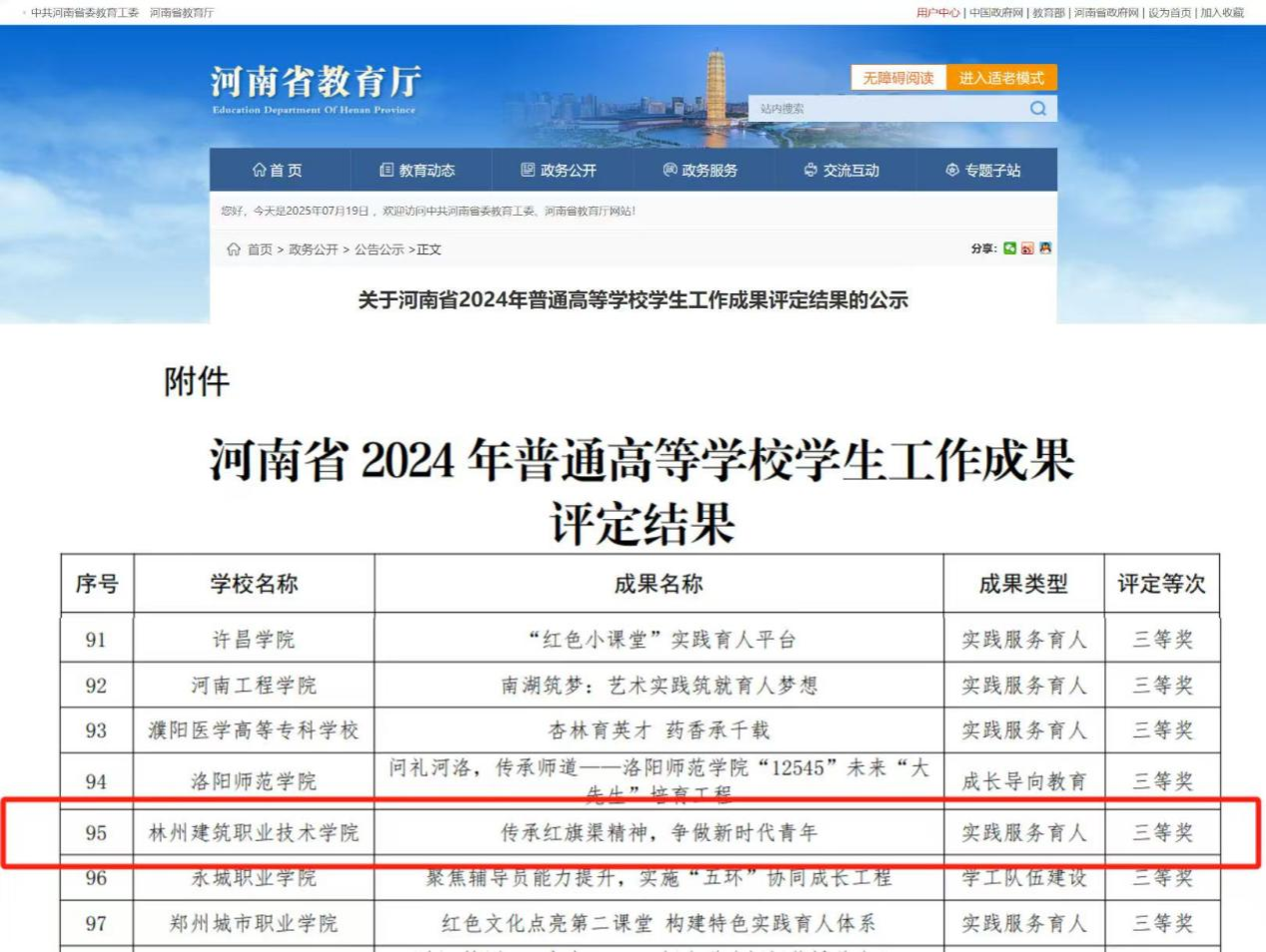 近日,河南省教育厅公示了2024年普通高等学校学生工作成果评定结果。开云官方端网页版登录入口申报的“传承红旗渠精神,争做新时代青年”实践育人项目荣获三等奖,展现了我校在思想政治教育与实践育人方面的显著成效。