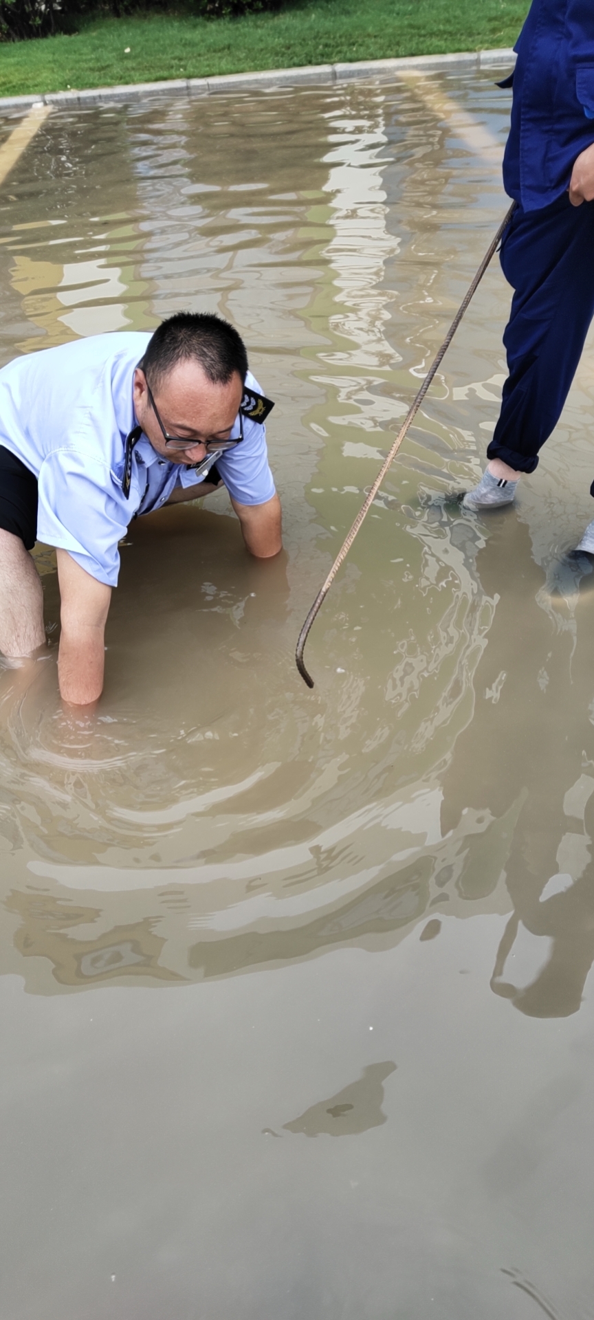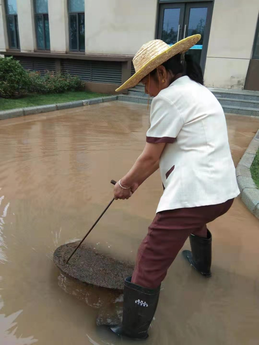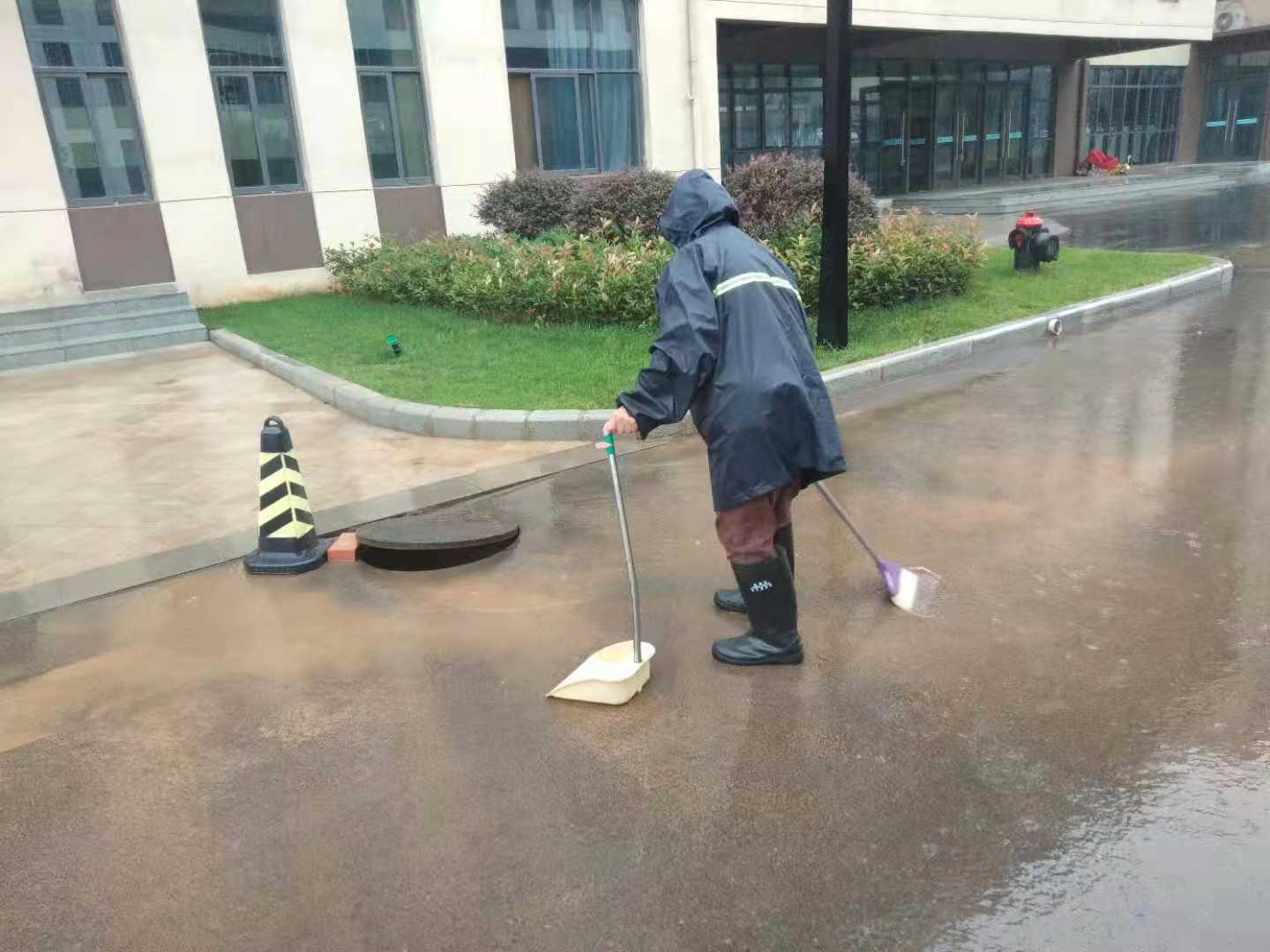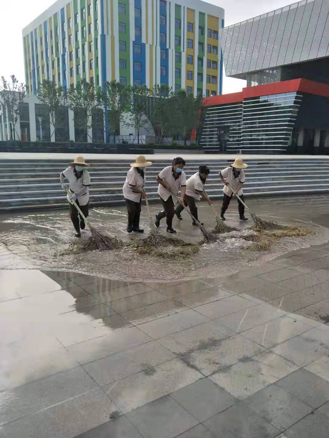 后勤处人员组织人员清理道路积水