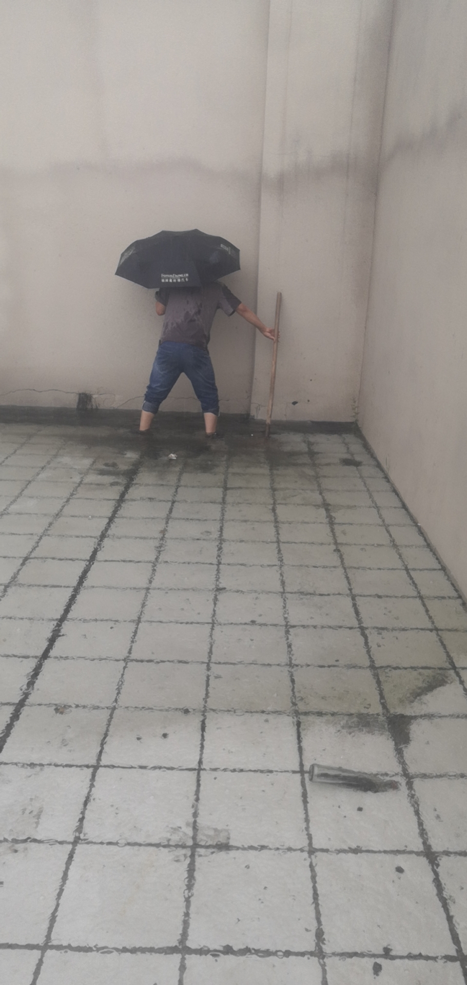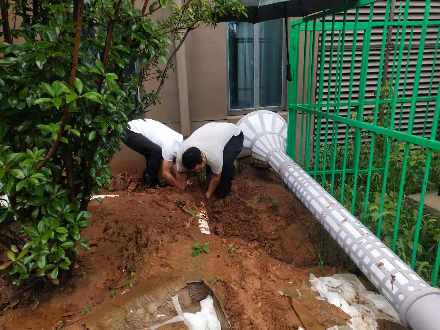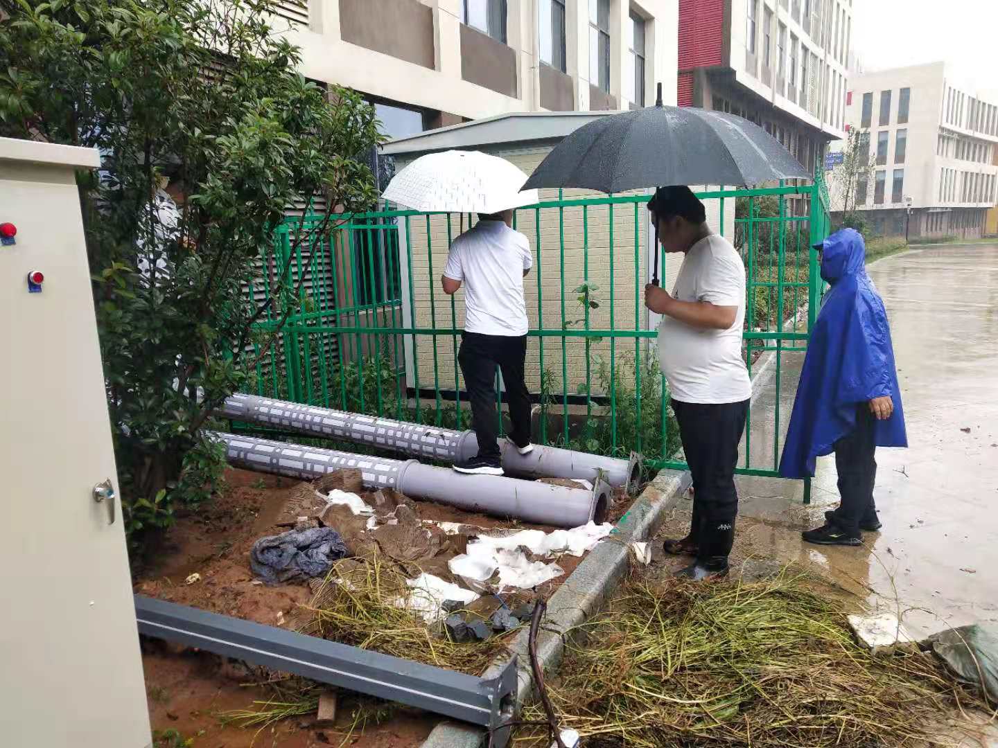 后勤处人员冒雨抢修楼宇排水管道,保证教学楼排水系统正常