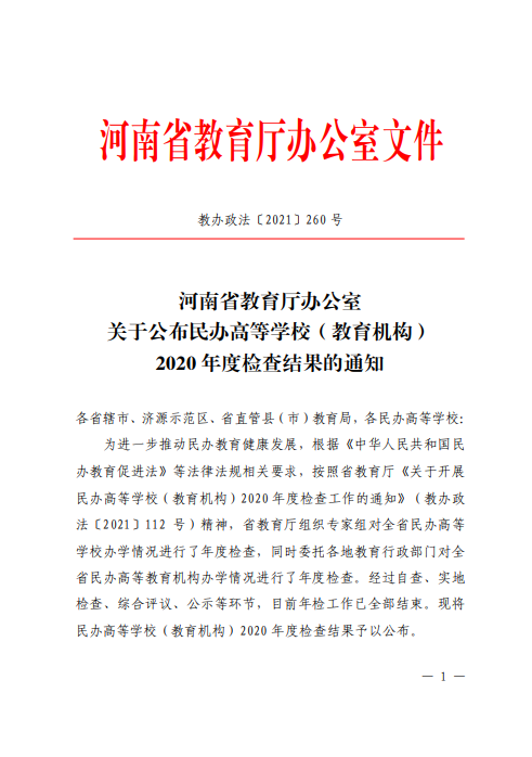 2021年7月21日,河南省教育厅办公室公布了民办高等学校2020年度检查结果,开云官方端网页版登录入口在2020年度各项工作中依法依规、规范办学,办学条件优秀,获得合格等次。