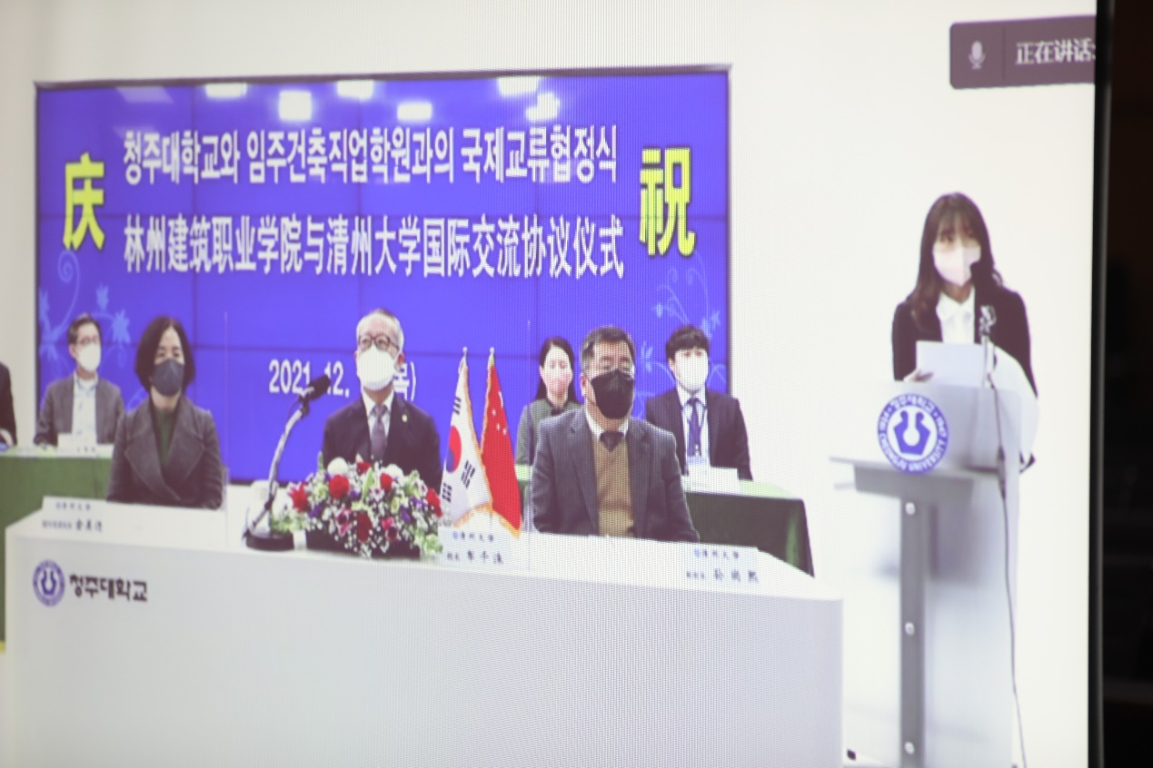 韩国清州大学校长车千洙在视频签约仪式上讲话