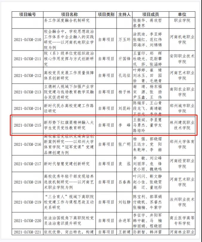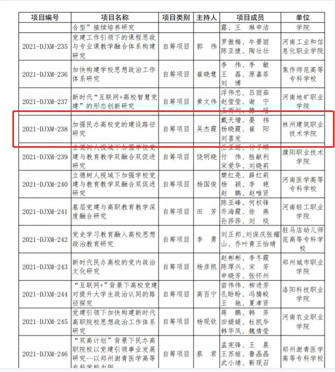 林州建院创办以来,学校党委高度重视党建研究工作,依托红旗渠红色资源优势,不断加强对党建研究工作的支持力度。在申报党建项目立项工作中,统筹安排,积极申报,并成功立项。