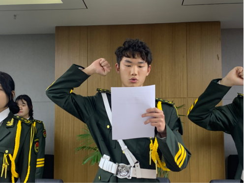 王帅同学作为国旗护卫队第一任政委,他带领全体国旗护卫队成员庄严宣誓:“以我火红的青春,谱写国旗礼赞,用我热忱的生命捍卫国旗尊严。”