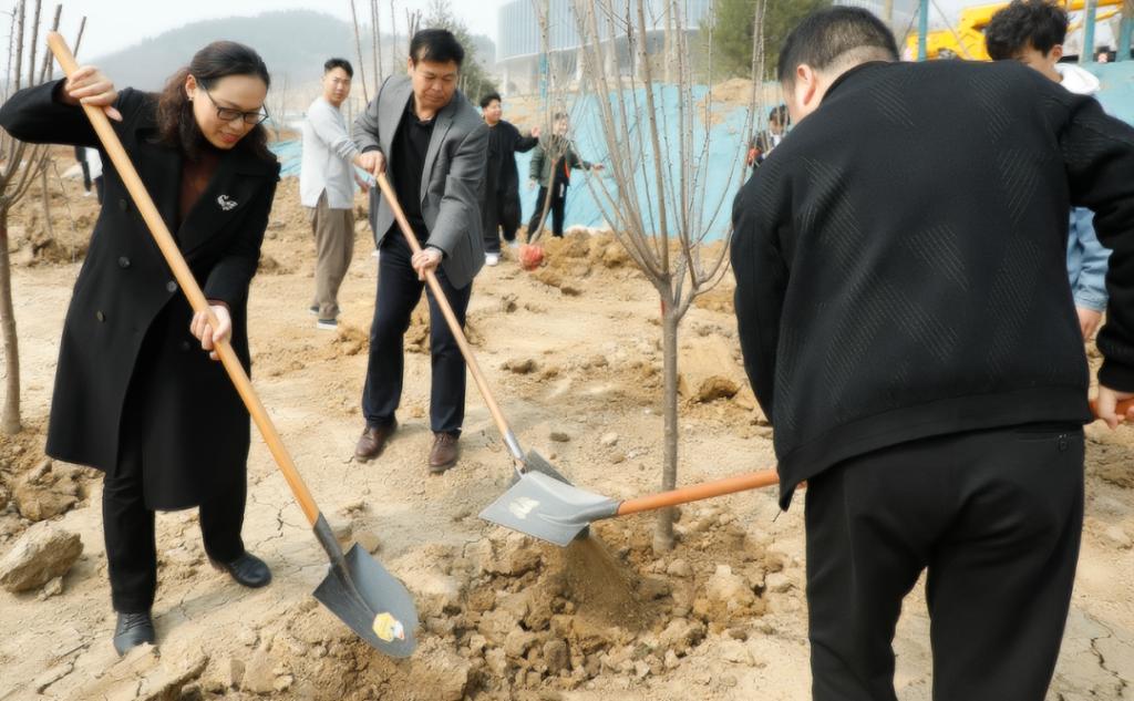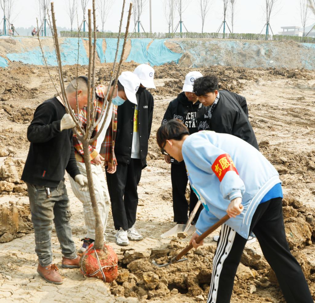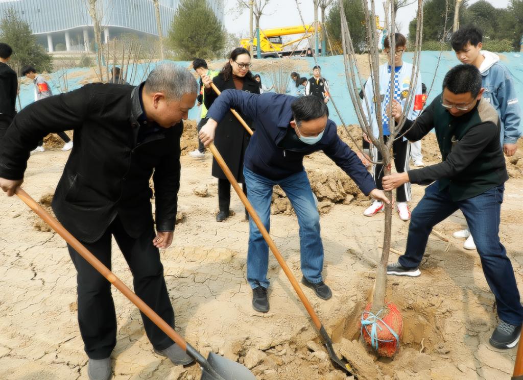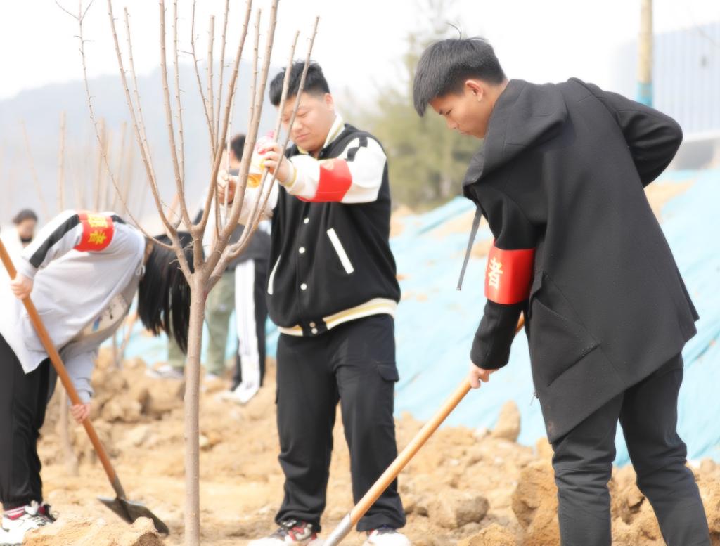 校领导班子成员带领志愿者们拿起铁锹,在指定位置种植树苗。大家分工明确,干劲十足,相互协作,完成了挖坑、插苗、填土等一系列操作。将一棵棵充满生机和希望的树苗,植入小坑之内,同时也把满满的希望和爱心载入土壤之中。