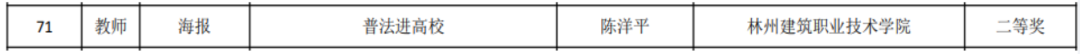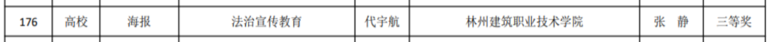 近日,由河南省教育厅主办的全省教育系统法治宣传教育书法、海报设计作品征集活动获奖名单公示,林州建院智能建造系教师陈洋平的海报作品《普法进高校》获得教师组二等奖,学生代宇航的海报作品《法治宣传教育》(指导教师:张静)获得学生组三等奖。