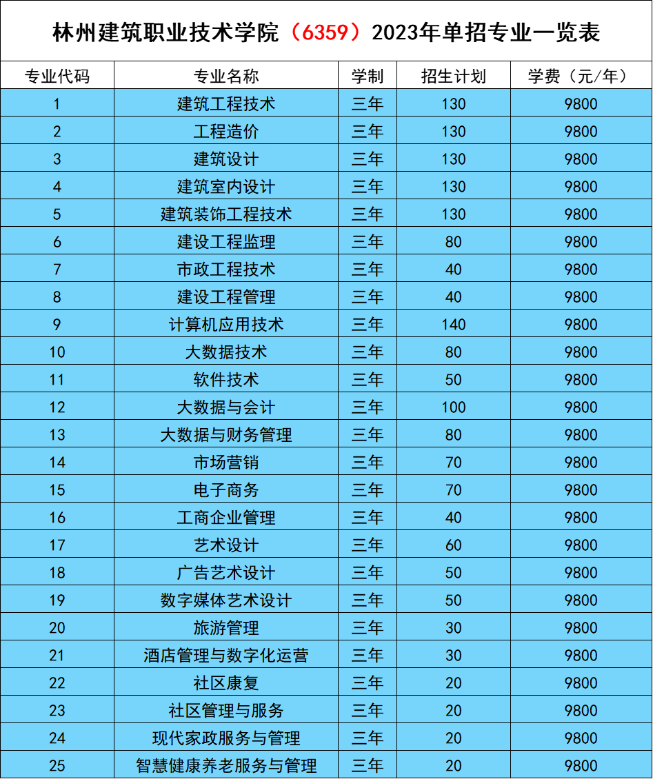 2023年学校面向河南省组织全日制统招专科层次的单独招生录取工作,共安排25个招生专业,学制三年,分别是建筑工程技术、工程造价、建筑设计、建筑室内设计、建筑装饰工程技术、建设工程监理、市政工程技术、建设工程管理、计算机应用技术、大数据技术、软件技术、大数据与会计、大数据与财务管理、市场营销、电子商务、工商企业管理、艺术设计、广告艺术设计、数字媒体艺术设计、旅游管理、酒店管理与数字化运营、社区康复、社区管理与服务、现代家政服务与管理、智慧健康养老服务与管理。具体招生专业及计划以省招生主管部门批准公布为准。