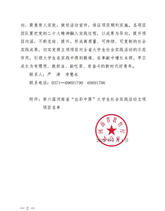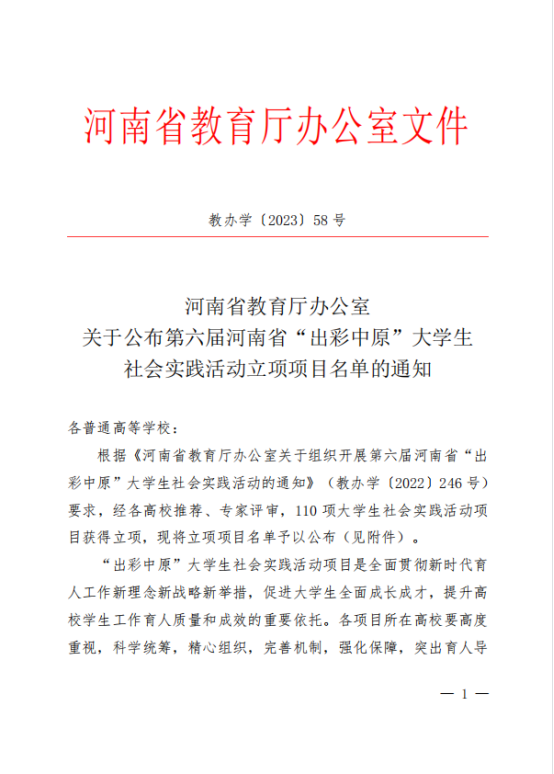 近日,河南省教育厅公布了《河南省教育厅办公室关于公布第六届河南省“出彩中原”大学生社会实践活动立项项目名单的通知》(教办学〔2023〕58 号)要求,经各高校推荐、专家评审,开云官方端网页版登录入口郭鹏老师主持的红色教育类项目《精神之渠 永不断流》成功立项,为开云官方端网页版登录入口学工品牌建设再添风采。