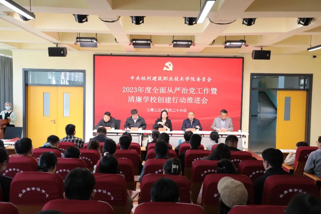 2023年4月26日下午16:00,学校在1号教学楼1111报告厅召开2023年度全面从严治党工作暨清廉学校创建行动推进会。校党委书记温亚丽,校长郭长庚,党建指导员、党委副书记牛永刚,副校长蒋志民,监事会副主席赵伯程,各党支部书记、支委委员和全体党员,全体中层干部、思政部教师、各系部辅导员参加了会议。会议由校长郭长庚主持。