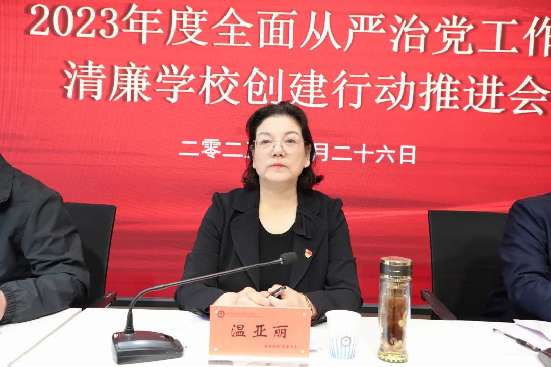 党委书记温亚丽作全面从严治党工作报告。温书记首先简要回顾总结了2022年学校全面从严治党工作取得的新成效,指出了工作中存在的问题,对学校2023年开展学习习近平新时代中国特色社会主义思想主题教育、学习宣传贯彻党的二十大精神、开展清廉学校创建行动等全面从严治党重点工作进行了再动员再部署,并提出如下三项要求:一要提高政治站位,统一思想认识,深刻领悟全面从严治党重大意义;二要全面加强党的领导,认真做好党建各项工作,当好“明白人”“护航人”“带头人”“干净人”;三要压紧压实责任,确保全面从严治党各项任务落到实处。党委领导班子成员、各党支部、全体党员干部要充分发挥示范引领作用,高标准做好党建各项工作,持之以恒推进全面从严治党,营造风清气正的良好政治生态,凝心聚力、开拓进取,克难攻坚、砥砺前行,为推进学校高质量发展做出积极贡献。